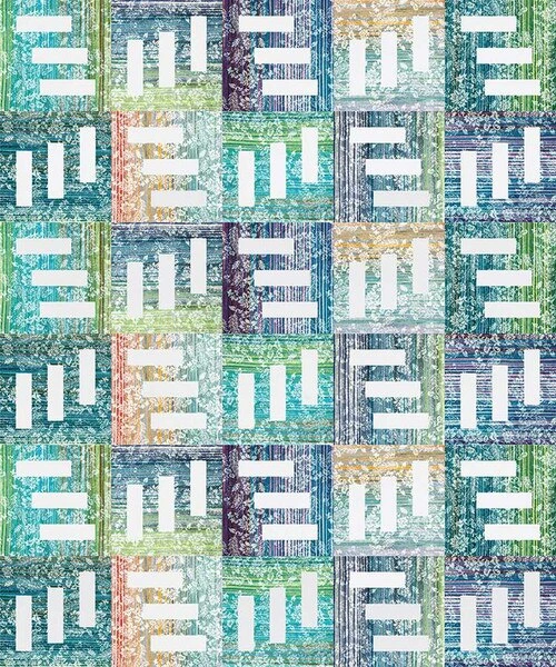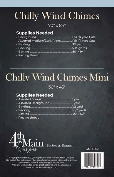 Item Description: The Chilly Wind Chimes Quilt by Scott Flanagan of 4th & Main Designs features white strips set in color. Finished size is 70″ x 84″.