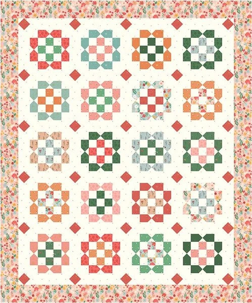 Item Description: The Wildflower Quilt by Amanda Niederhauser of Jedi Craft Girl is Rolie Polie friendly and features pieced flower blocks. Finished size is 64″ x 77″.