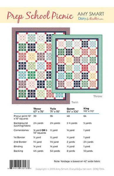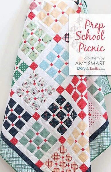 Item Description: The Prep School Picnic Quilt by Amy Smart of Diary of a Quilter features framed nine-patch blocks with sashing and posts. Finished size is 67″ x 78″.