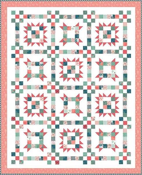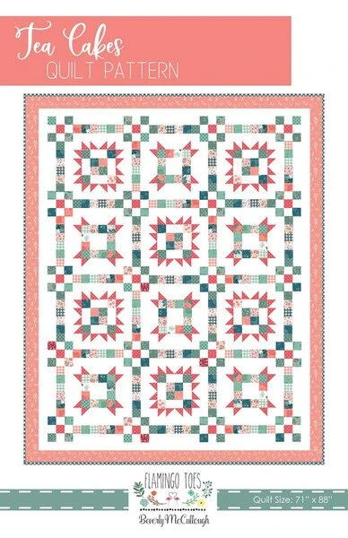 Item Description: The Tea Cakes Quilt by Beverly McCullough of Flamingo Toes is as sweet as can be! Made of patchwork style repeating blocks, this quilt is fast and fun to sew! The pattern is precut friendly and is designed to work with a 2 1/2″ rolie polie. Finished size is 71″ x 88″.