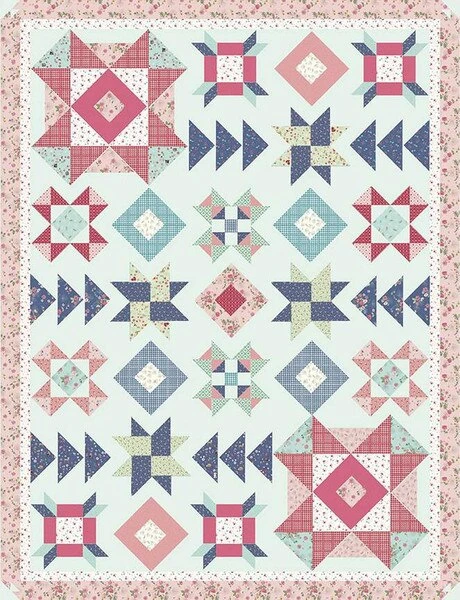 Item Description: The Wildflower Fields Quilt by Beverly McCullough of Flamingo Toes features a variety of pieced blocks. Finished size is 71″ x 93″.