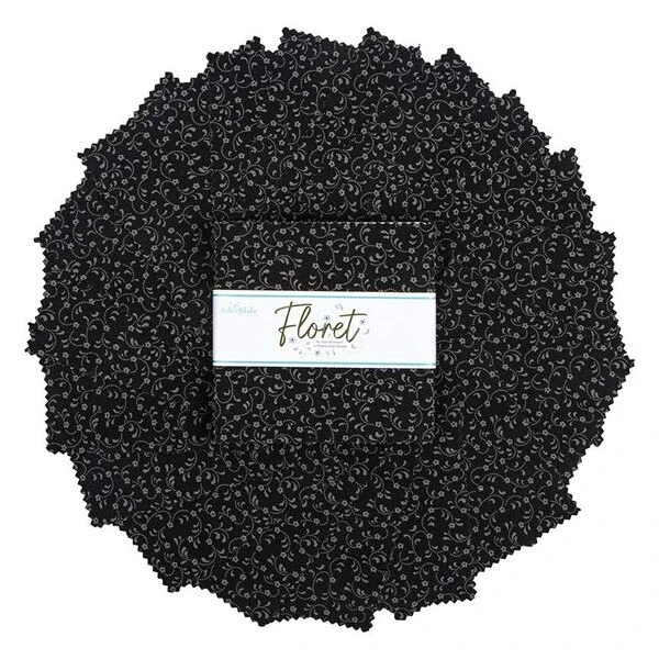Item Description: This 5″ Stacker single-color precut bundle includes 42 pieces from the Floret collection by Gerri Robinson of Planted Seed Designs for Riley Blake Designs. The black print will be included 42 times in the bundle.