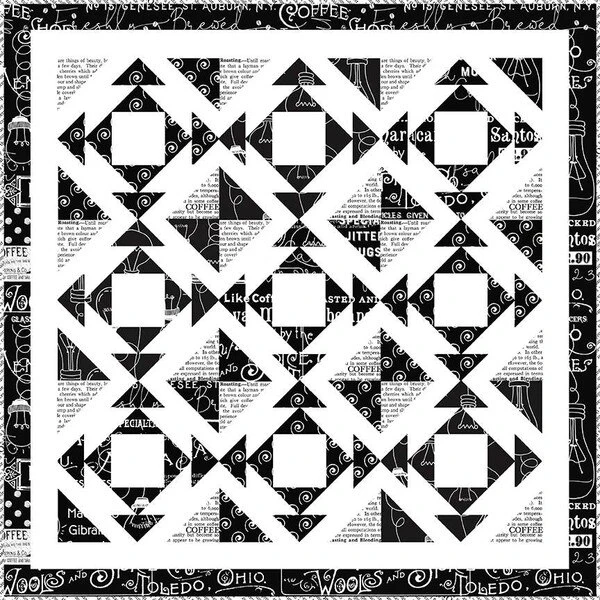 Item Description: The Cups & Saucers Quilt by J. Wecker Frisch features nine pieced black and white blacks. Finished size is 44 1/2″ x 44 1/2″.