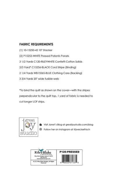 Item Description: The Pressed Patch Quilt by J. Wecker Frisch is 10″ stacker friendly and uses the Pressed Patents Panel (P15253-WHITE). Finished size is 70″ x 70″.
