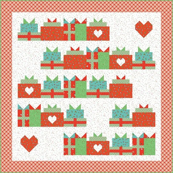 Item Description: The Gifts from the Heart Quilt by Jennifer Long of Sew A Story features rows of pieced presents. Finished size is 60″ x 60″.