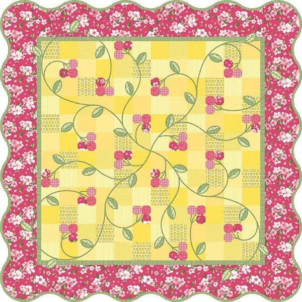 Item Description: The Cherries Jubilee Quilt by Jill Finley of Jillily Studio features pieced cherries and applied leaves and stems. Finished size is 62″ x 62″.