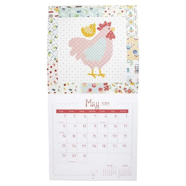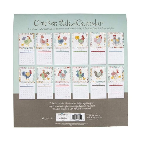 Item Description: The 2022 Chicken Salad Calendar by Lori Holt of Bee in my Bonnet runs from January 2022 through December 2022 and features the roosters and hens from her Chicken Salad Quilt. The calendar is printed on premium paper, features major holidays, and is large enough to write in important dates and reminders. Size is 12″ x 12″.