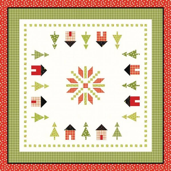 Item Description: The On the Square Quilt by Sandy Gervais of Pieces from My Heart features pieced houses and pine trees set around a large pieced snowflake and set off with multiple borders. Finished size is 71″ x 71″.