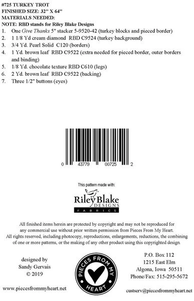 Item Description: The Turkey Trot Table Runner by Sandy Gervais of Pieces from My Heart features 3 pieced turkeys surrounded by a scrappy border and is 5″ stacker friendly. Finished size is 32″ x 64″.
