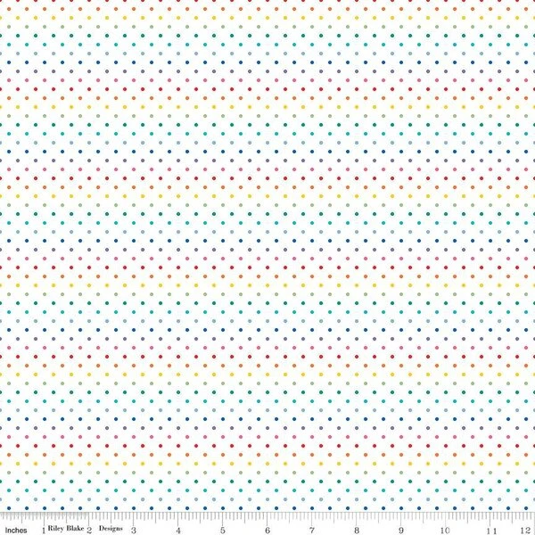Item Description: This Riley Blake Designs Basic fabric features small polka dots on a white background every 1/2″ along the fabric.