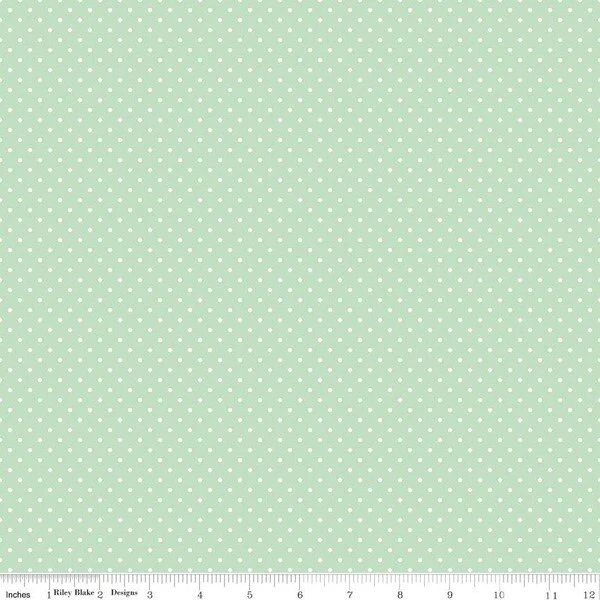 Item Description: This Riley Blake Designs Basic fabric features small white polka dots on a colored background every 1/2″ along the fabric.