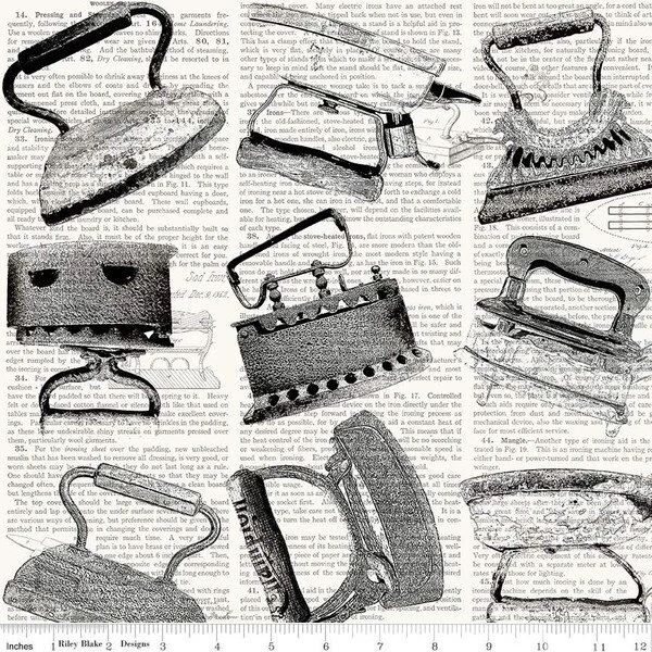 Item Description: Press On by J. Wecker Frisch for Riley Blake Designs is great for quilting, apparel and home decor. This print features vintage irons on a background of iron-themed text. It’s 107″/108″ wide to accommodate most quilt backs.